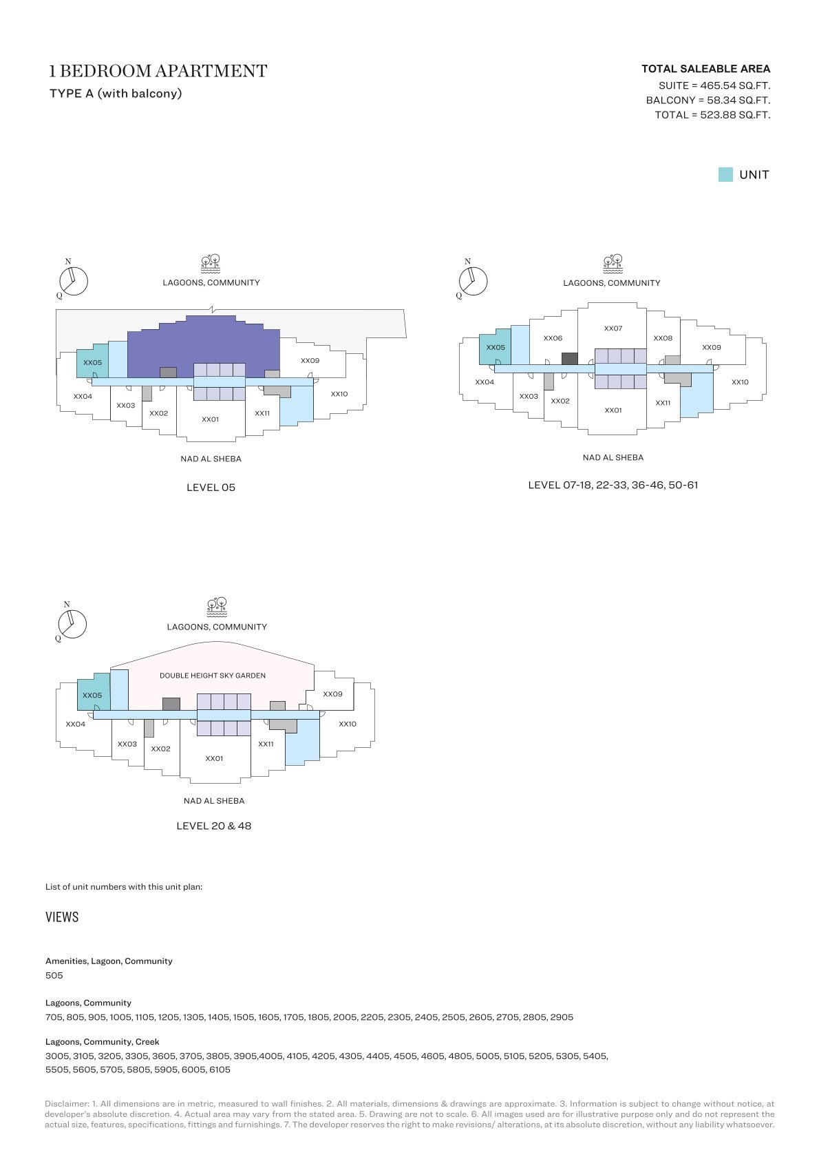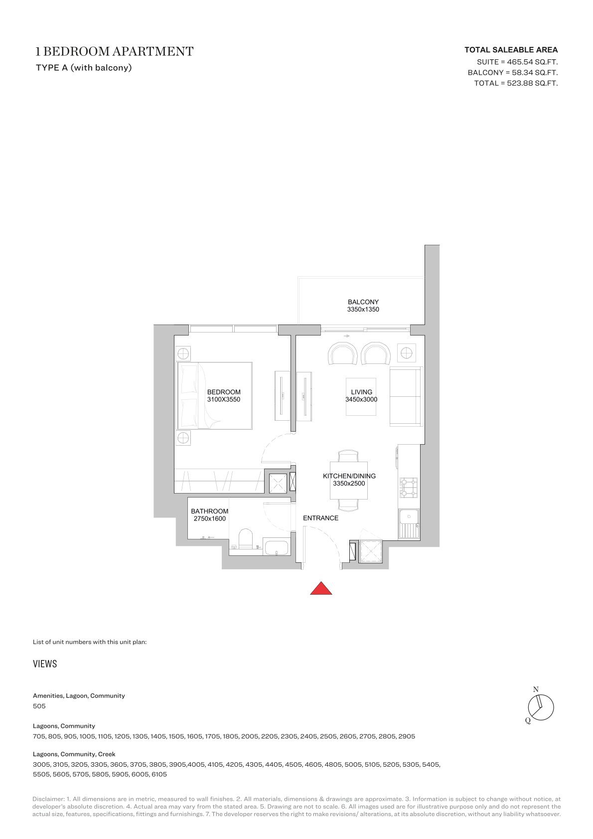 SUITE = 465.54 SQ.FT. BALCONY = 58.34 SQ.FT. TOTAL = 523.88 SQ.FT