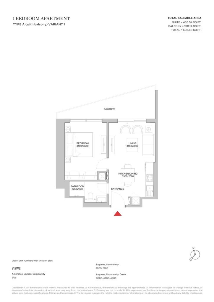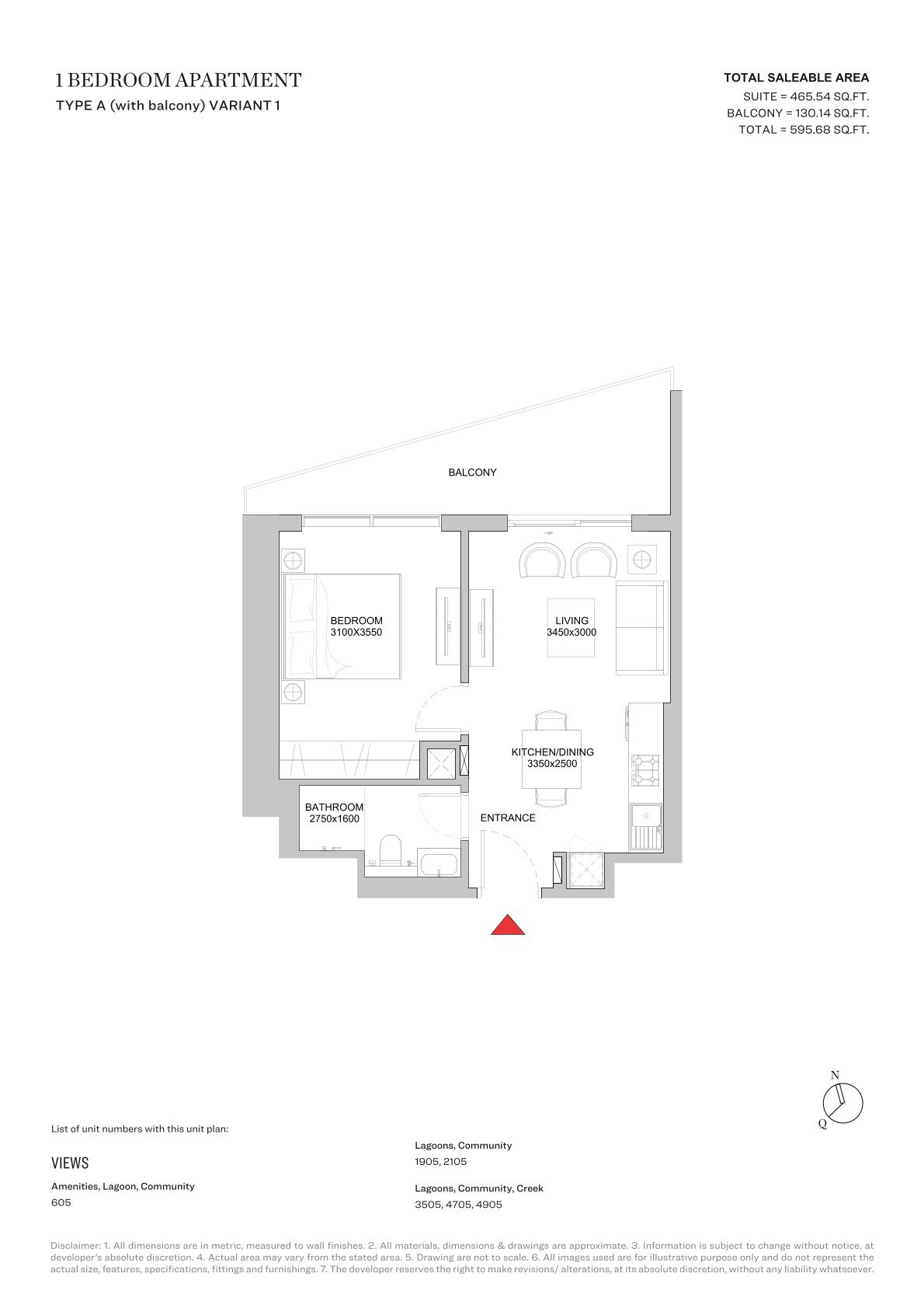 SUITE = 465.54 SQ.FT. BALCONY = 130.14 SQ.FT. TOTAL = 595.68 SQ.FT.