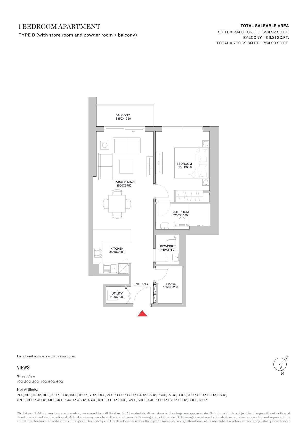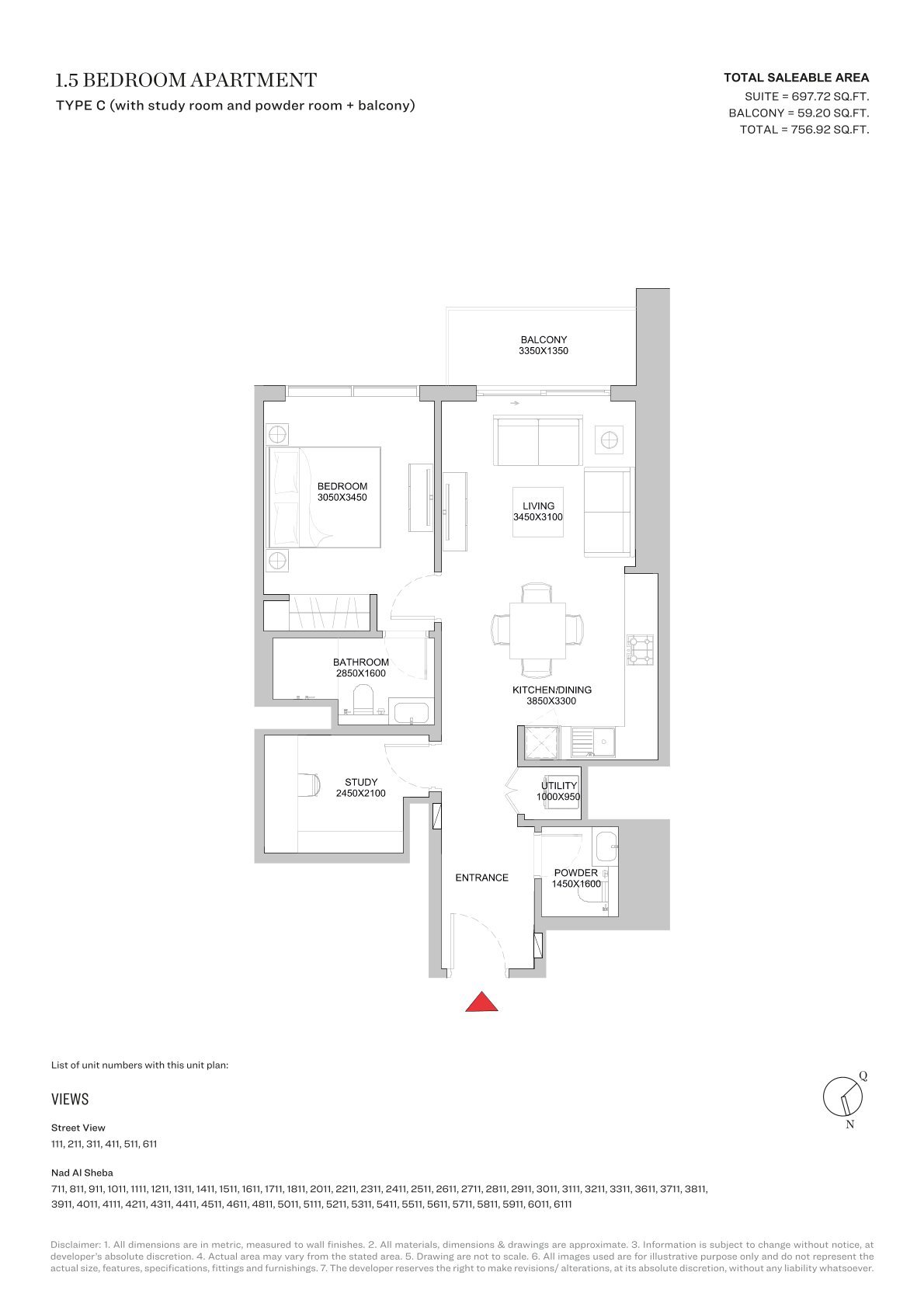SUITE = 697.72 SQ.FT. BALCONY = 59.20 SQ.FT. TOTAL = 756.92 SQ.FT