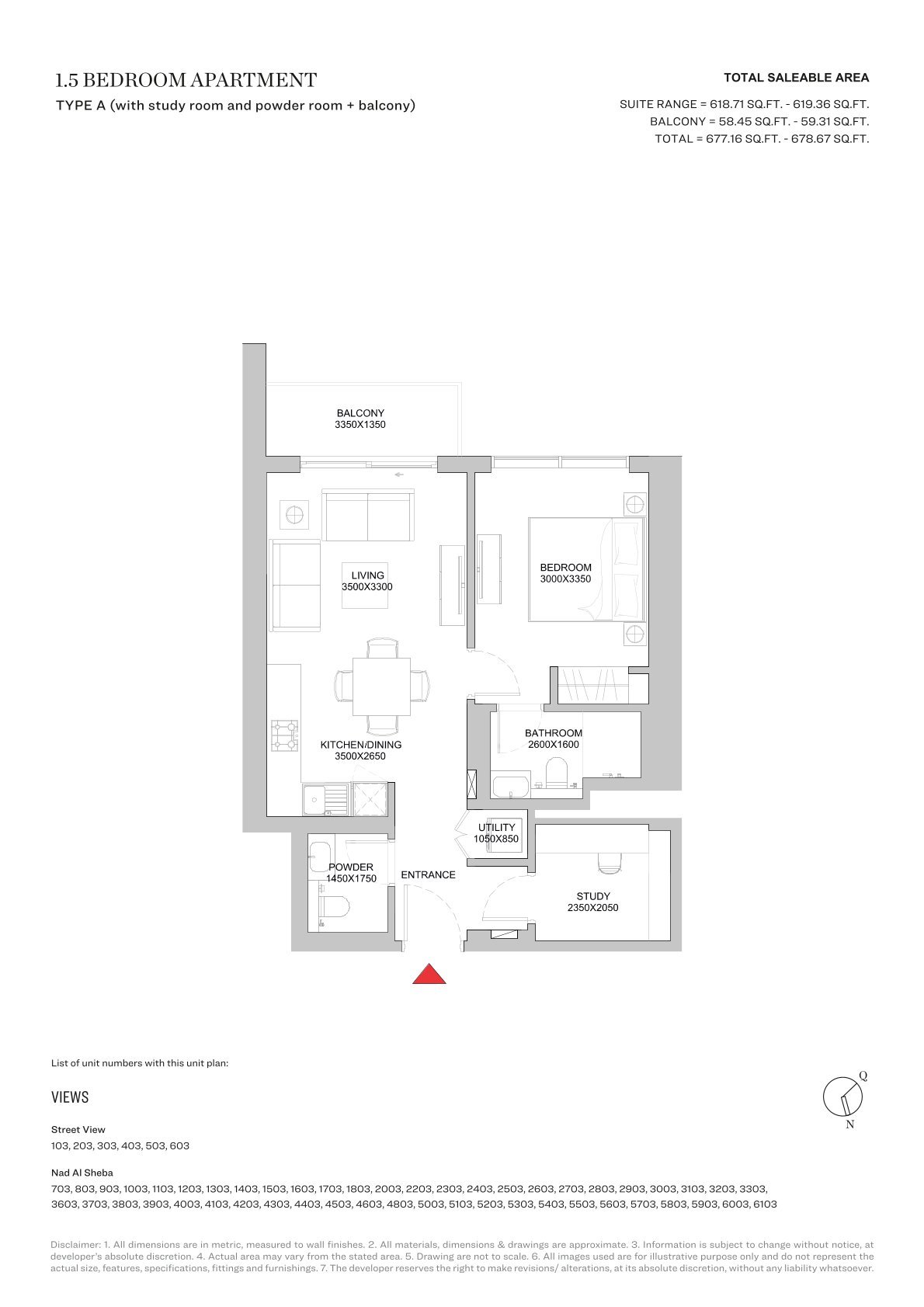 SUITE RANGE = 618.71 SQ.FT. BALCONY = 58.45 SQ.FT. TOTAL = 677.16 SQ.FT.