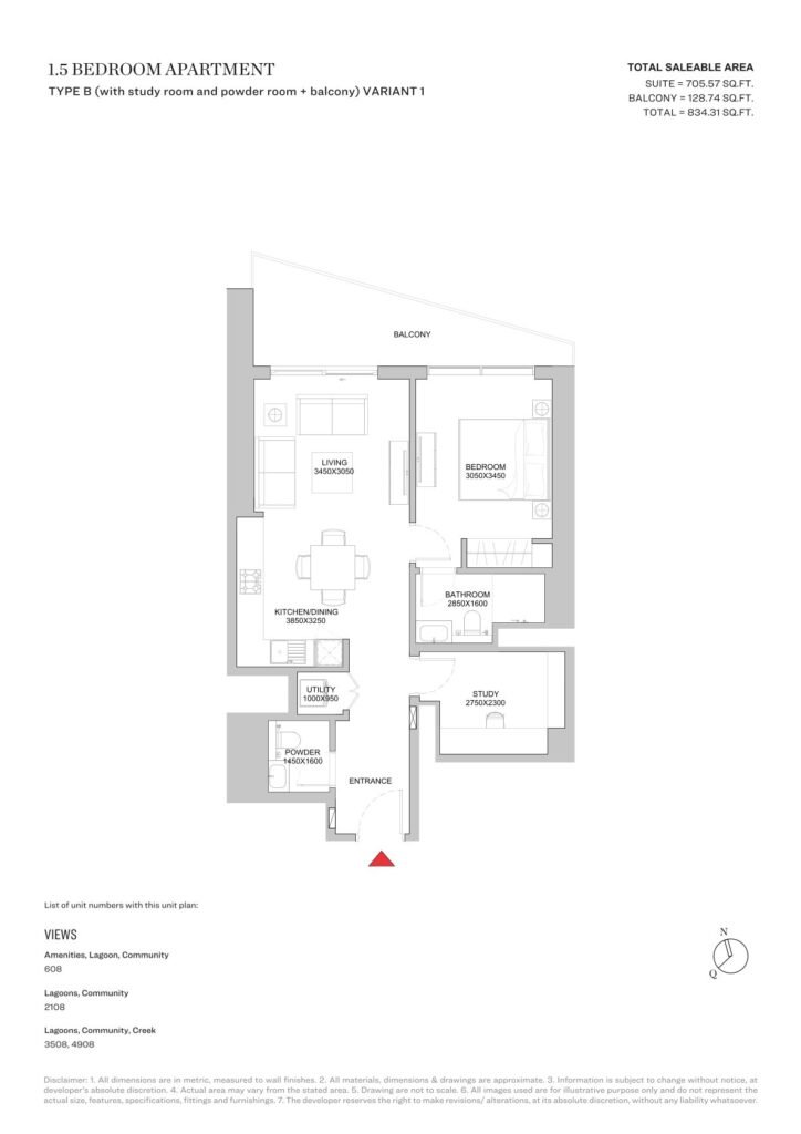 SUITE = 705.57 SQ.FT. BALCONY = 128.74 SQ.FT. TOTAL = 834.31 SQ.FT.