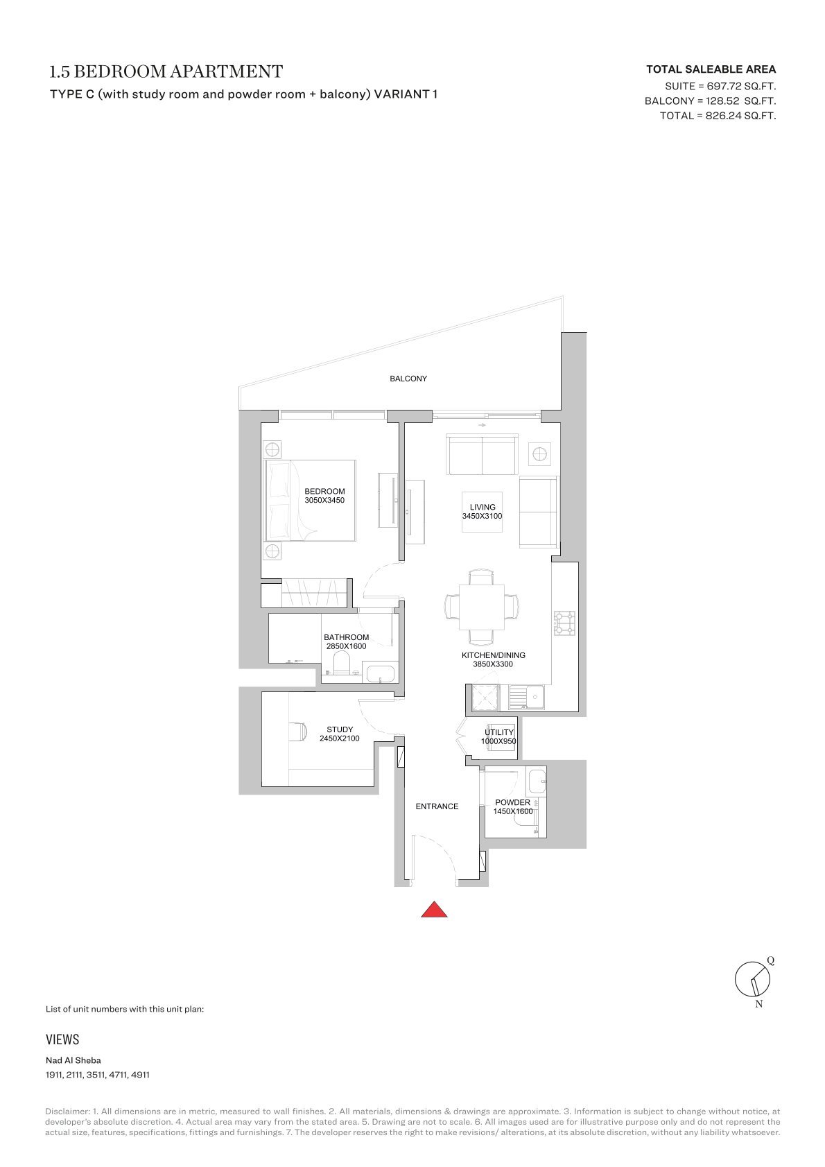 SUITE = 697.72 SQ.FT. BALCONY = 128.52 SQ.FT. TOTAL = 826.24 SQ.FT.