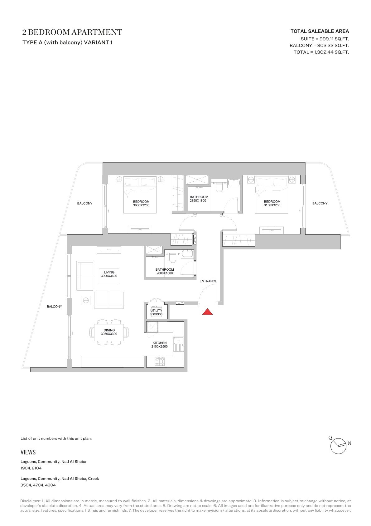 SUITE = 999.11 SQ.FT. BALCONY = 303.33 SQ.FT. TOTAL = 1,302.44 SQ.FT.