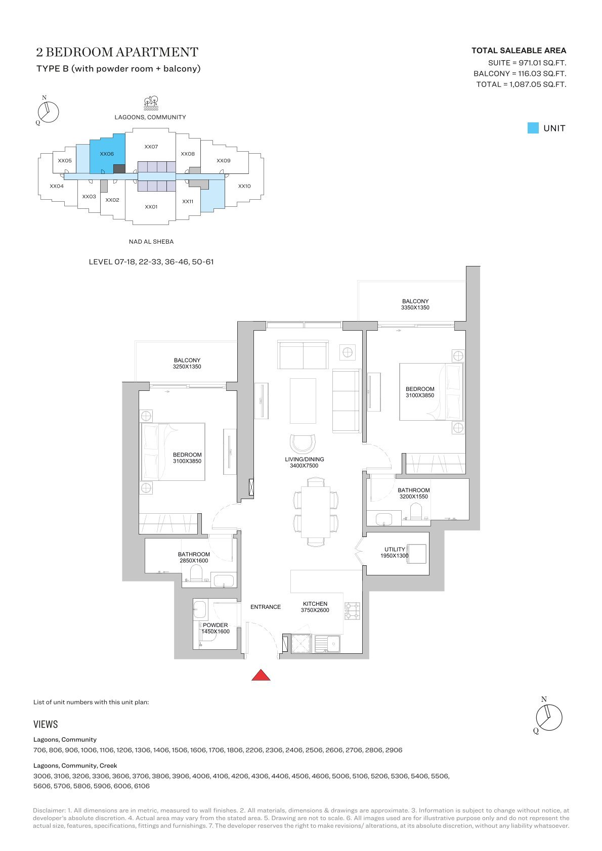SUITE = 971.01 SQ.FT. BALCONY = 116.03 SQ.FT. TOTAL = 1,087.05 SQ.FT.