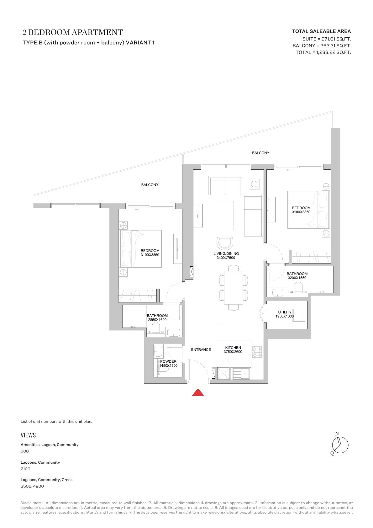 SUITE = 971.01 SQ.FT. BALCONY = 262.21 SQ.FT. TOTAL = 1,233.22 SQ.FT.