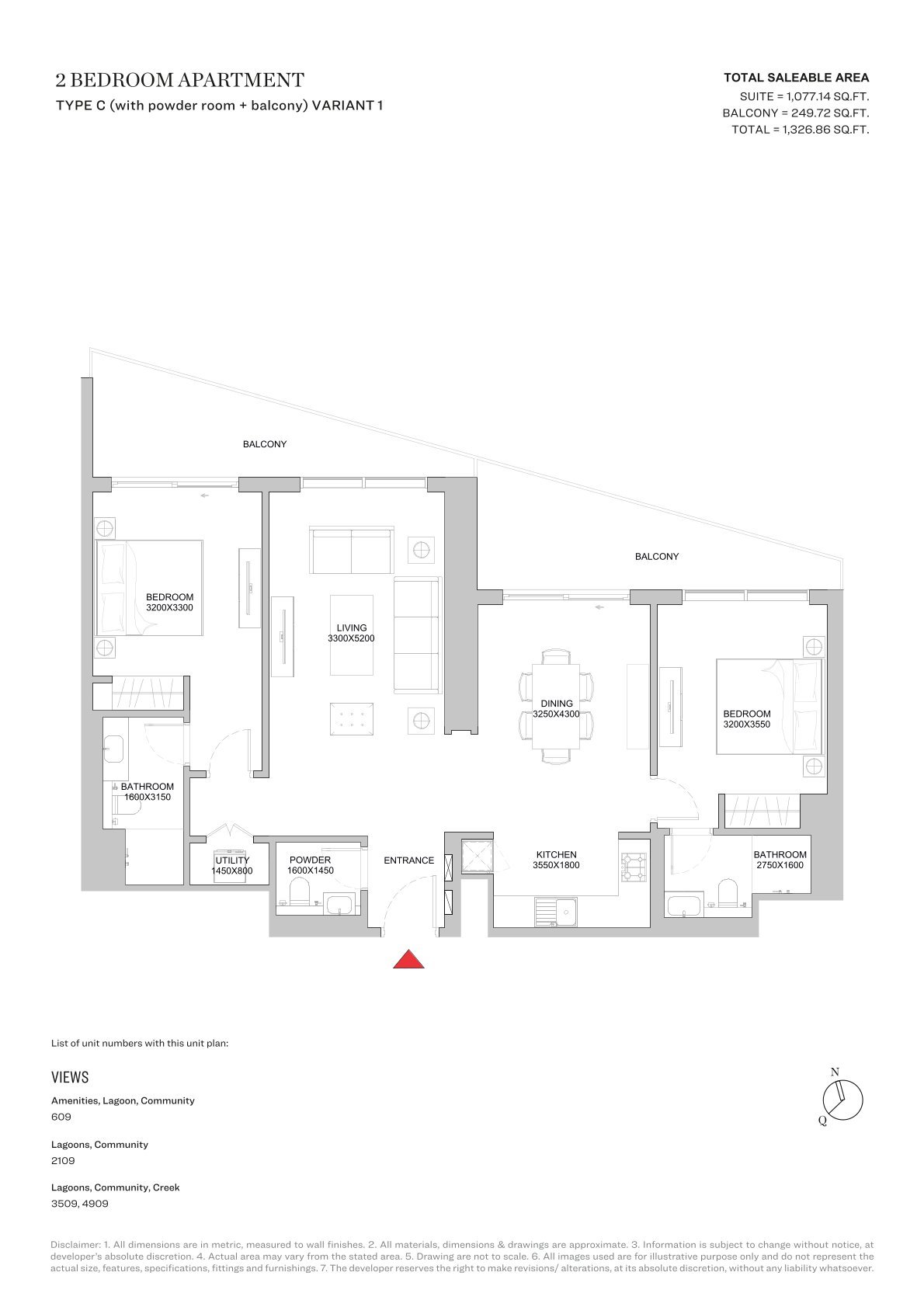 SUITE = 1,077.14 SQ.FT. BALCONY = 249.72 SQ.FT. TOTAL = 1,326.86 SQ.FT.