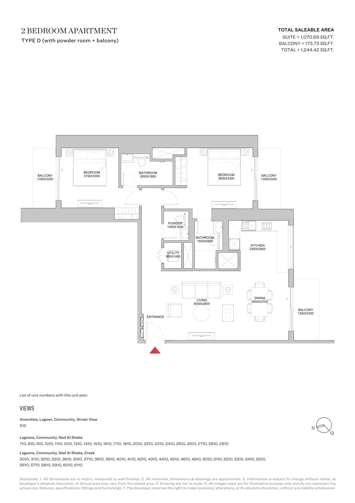 SUITE = 1,070.69 SQ.FT. BALCONY = 173.73 SQ.FT. TOTAL = 1,244.42 SQ.FT.