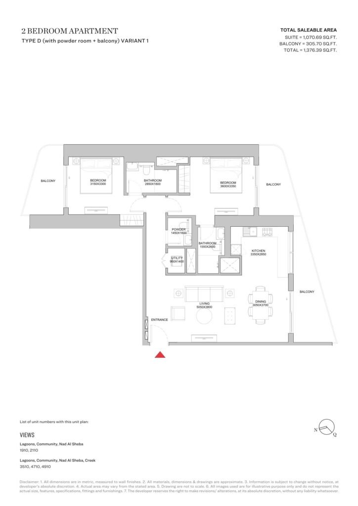 SUITE = 1,070.69 SQ.FT. BALCONY = 305.70 SQ.FT. TOTAL = 1,376.39 SQ.FT.