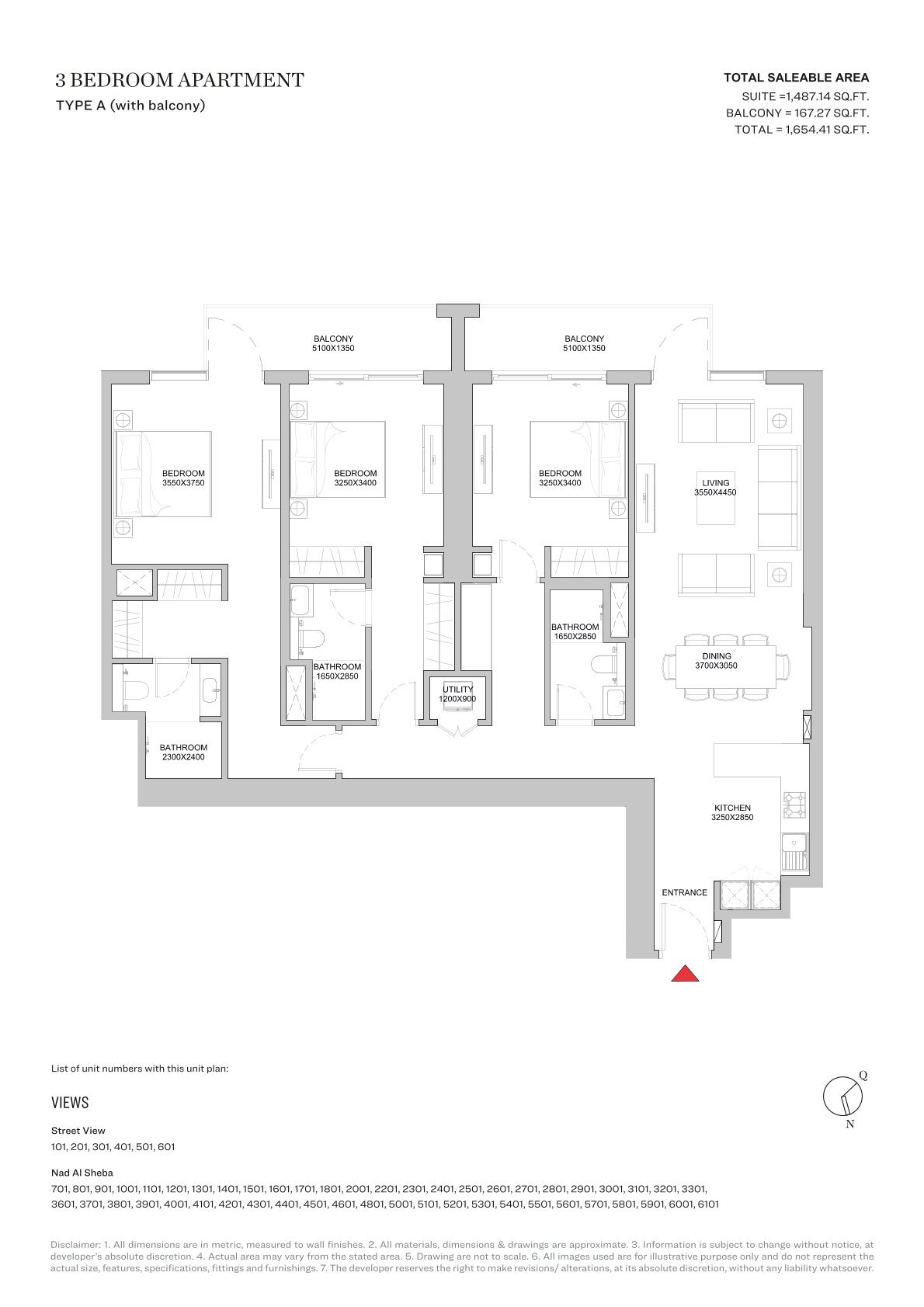 SUITE =1,487.14 SQ.FT. BALCONY = 167.27 SQ.FT. TOTAL = 1,654.41 SQ.FT.