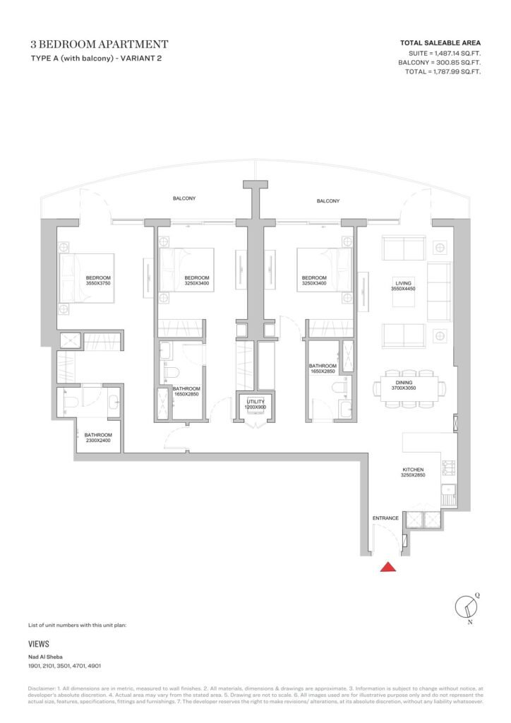 SUITE = 1,487.14 SQ.FT. BALCONY = 300.85 SQ.FT. TOTAL = 1,787.99 SQ.FT.
