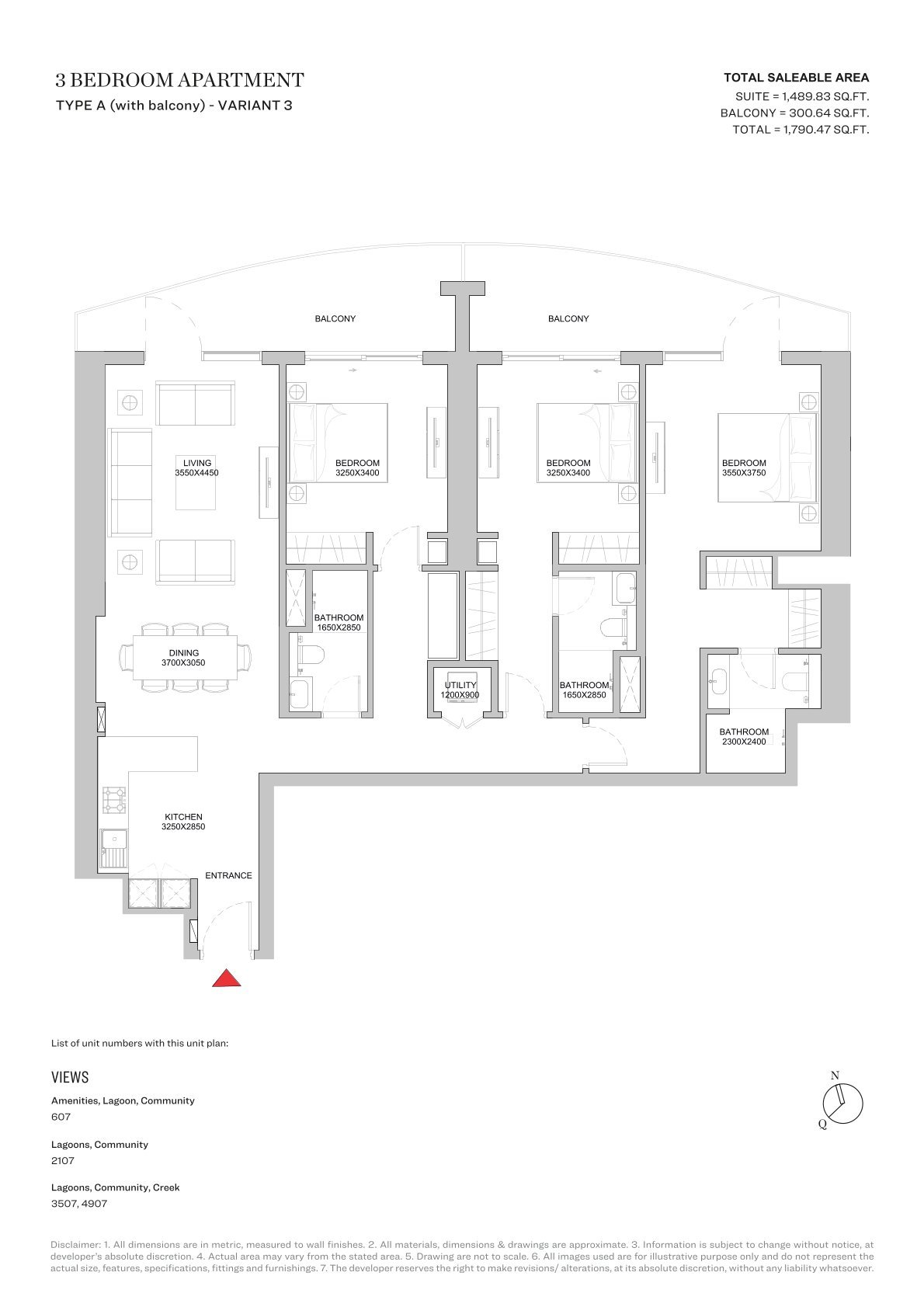 SUITE = 1,489.83 SQ.FT. BALCONY = 300.64 SQ.FT. TOTAL = 1,790.47 SQ.FT.